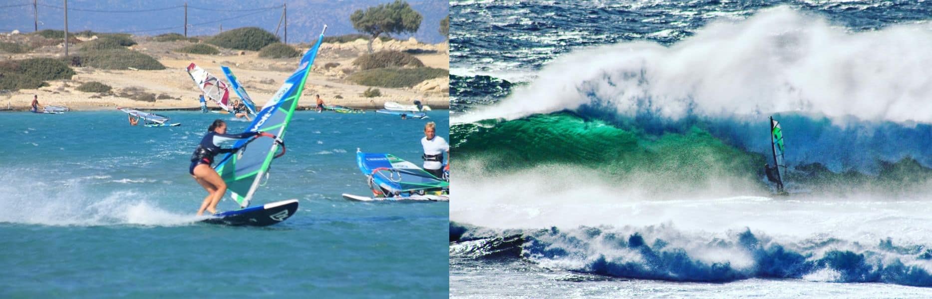Na zdjęciu po lewej widzicie Anię szlifującą rufę w ślizgu pod okiem Kołcza Winiara na Karpathos w 2016 roku. Warunki ku temu miała wymarzone: silny wiatr, płaska jak stół woda i rozległa płycizna. W tamtym czasie nawet sobie nie wyobrażała, że kiedyś spróbuje swoich sił na zafalowanym akwenie?
